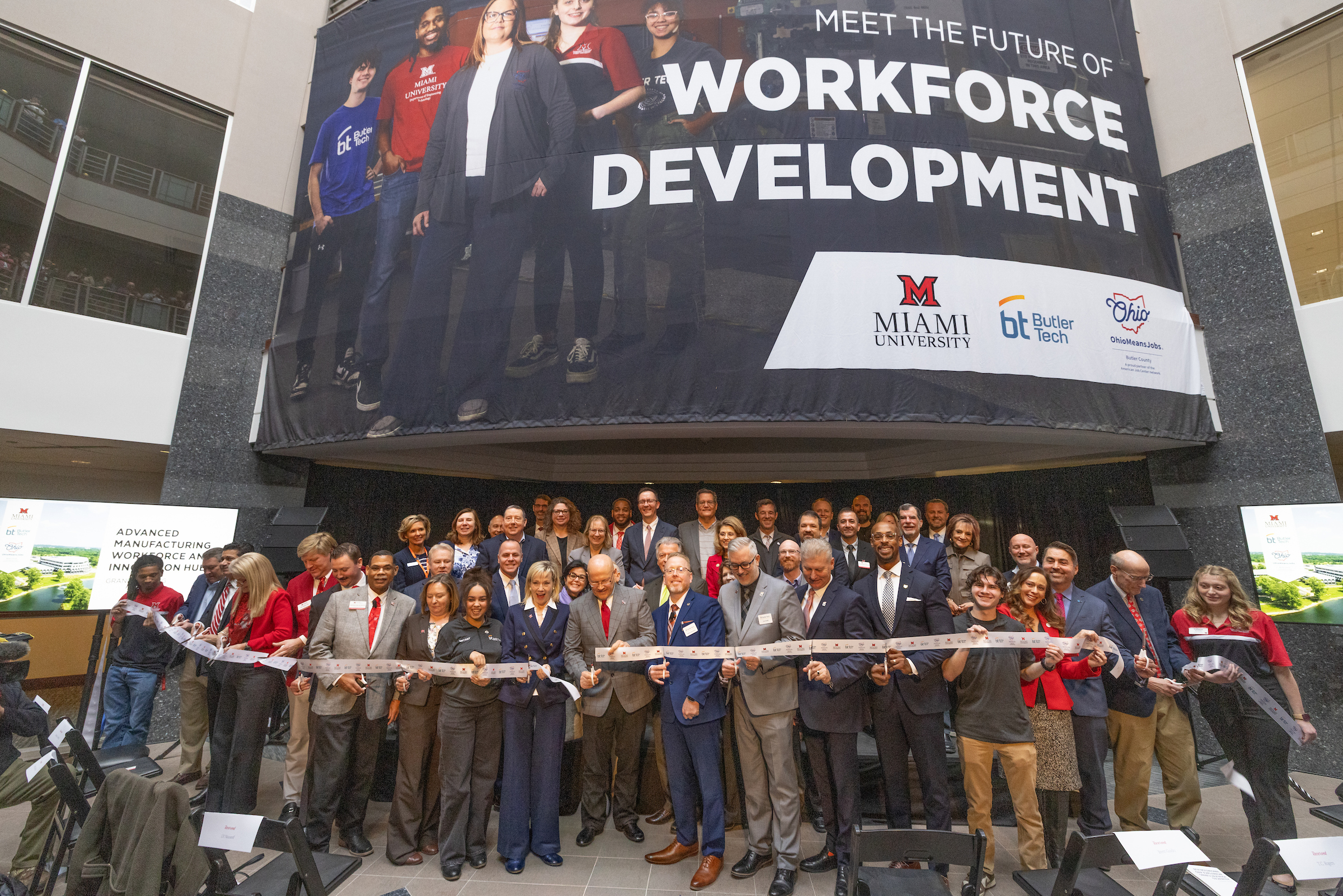 President Crawford, Sprankles, and Rep. Davidson were among 14 speakers at the event, which also included Mary Schell, chair of the Miami Board of Trustees; Brett Guido, president of the Butler Tech Board of Education; J.P. Nauseef, president and CEO of JobsOhio; T.C. Rogers, president of the Butler County Board of Commissioners; State Sen. George Lang; State Rep. Diane Mullins; Rick Carfagna, senior vice president of government affairs for the Ohio Chamber of Commerce; State Rep. Jennifer Gross; Zac Haines, Miami trustee; State Rep. Thomas Hall; and Ryan Augsburger, president of the Ohio Manufacturing Association.